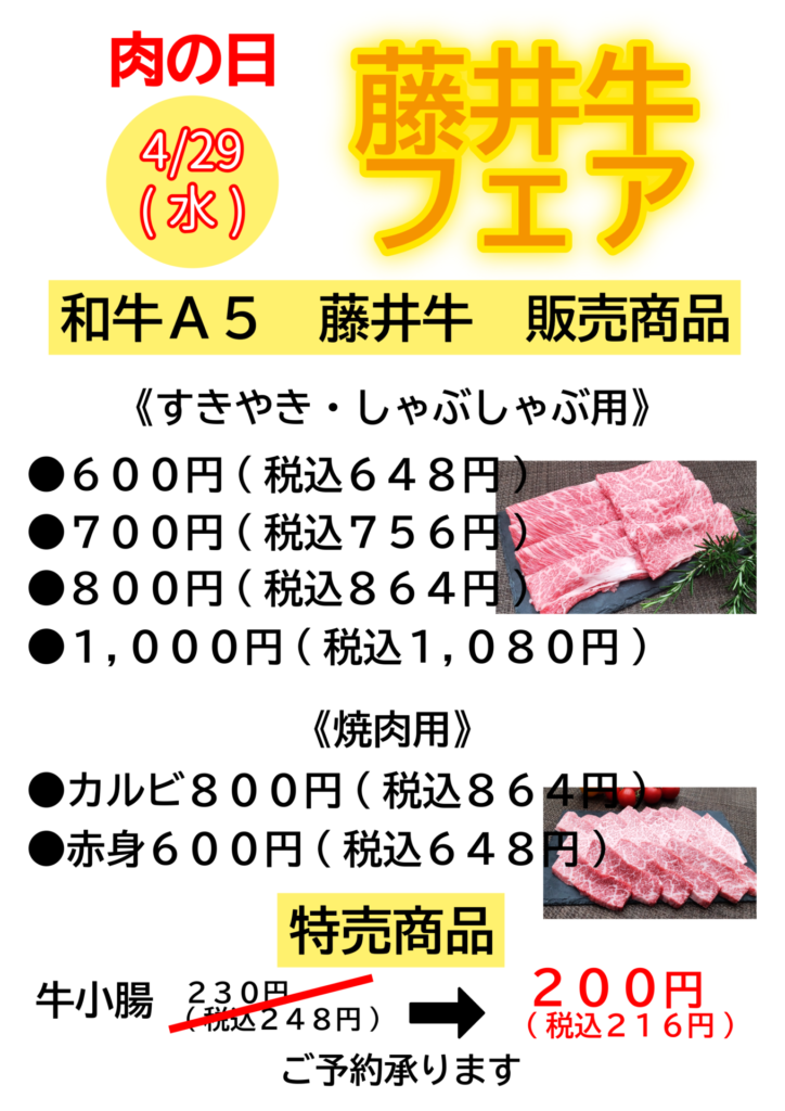 ☆4月29日(水)肉の日☆ 2026/04/22 藤井商店の牧場で育った “藤井牛” を販売いたします!! 和牛の中でもA5にランクされたきめが細かく、サシが多めの柔らかいお肉です。 すき焼き・しゃぶしゃぶ用、焼肉用 各種ご用意いたします! 藤井商店が愛情と丹精を込めて育てた牛を 自信を持って特別にご提供いたします。 普段食べなれたお肉との違いを感じながら ぜひ召し上がってみてください! 今年のGWは3日(日)のみお休みいただきますが、祝日は営業しております。 ご来店をお待ちしております。